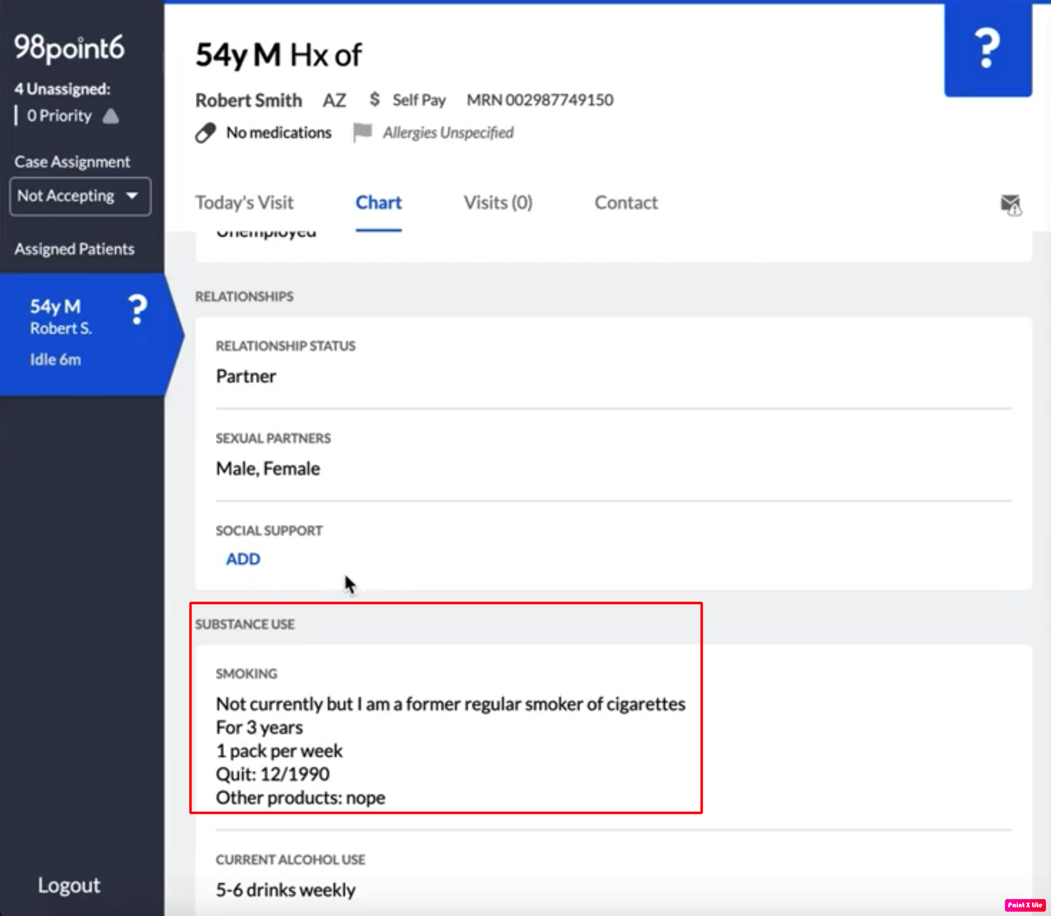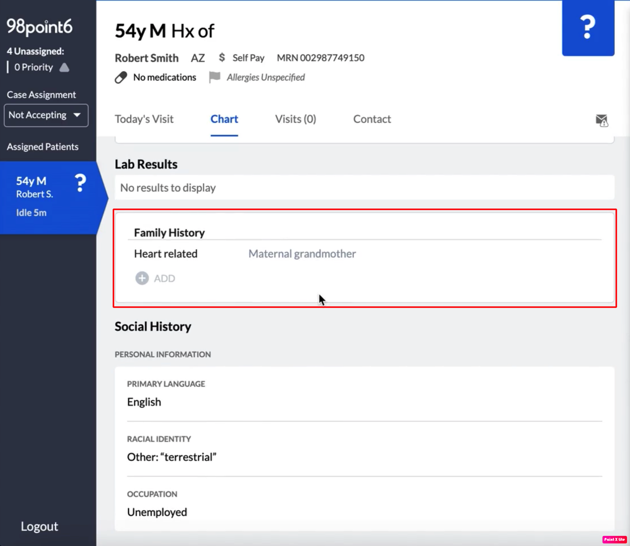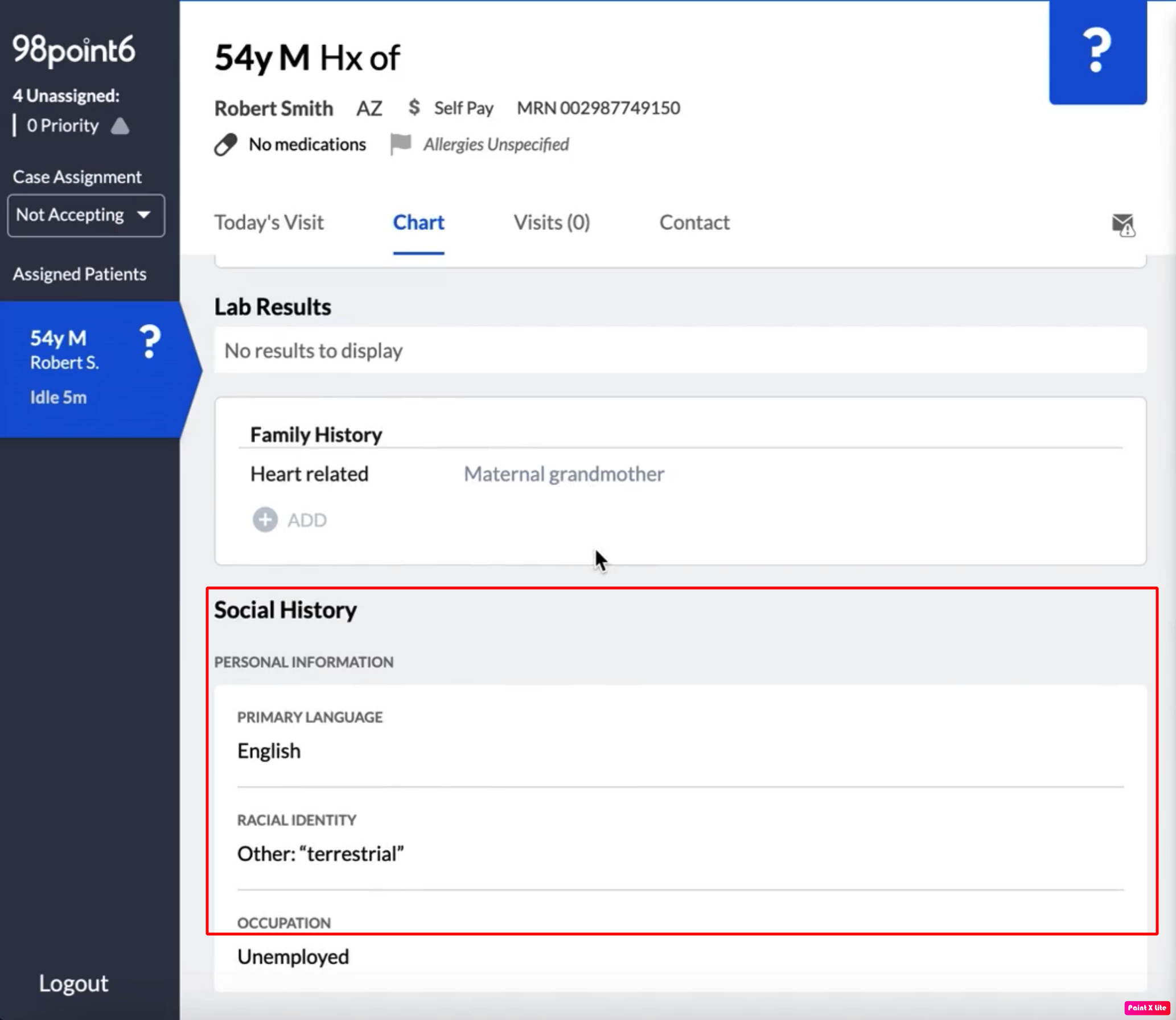 The Social History includes information the patient provided during their onboarding session, when registered their 98point6 account. Here, you’ll find information such as preferred language, race, occupation, and so forth.