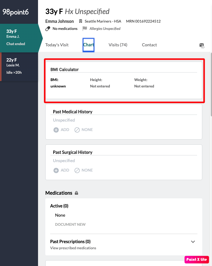 The BMI Calculator contains the patient’s height and weight, as entered by the patient. The BMI automatically calculates based on this information.