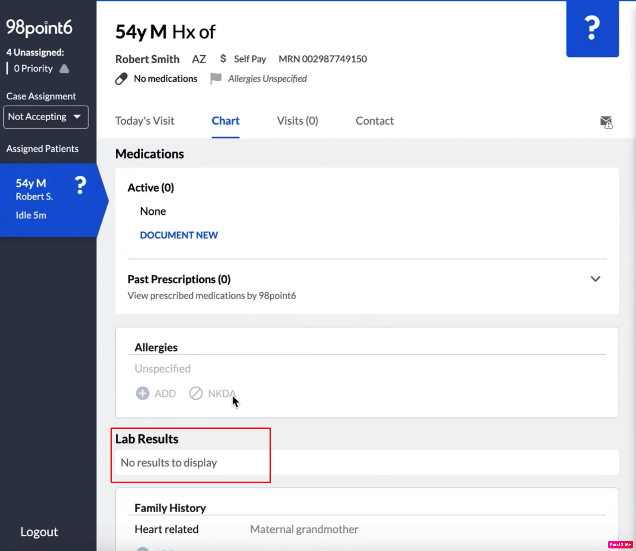The Lab Results section contains the results of labs ordered during patient visits. This field does not require updates because it automatically updates when lab results are ready.