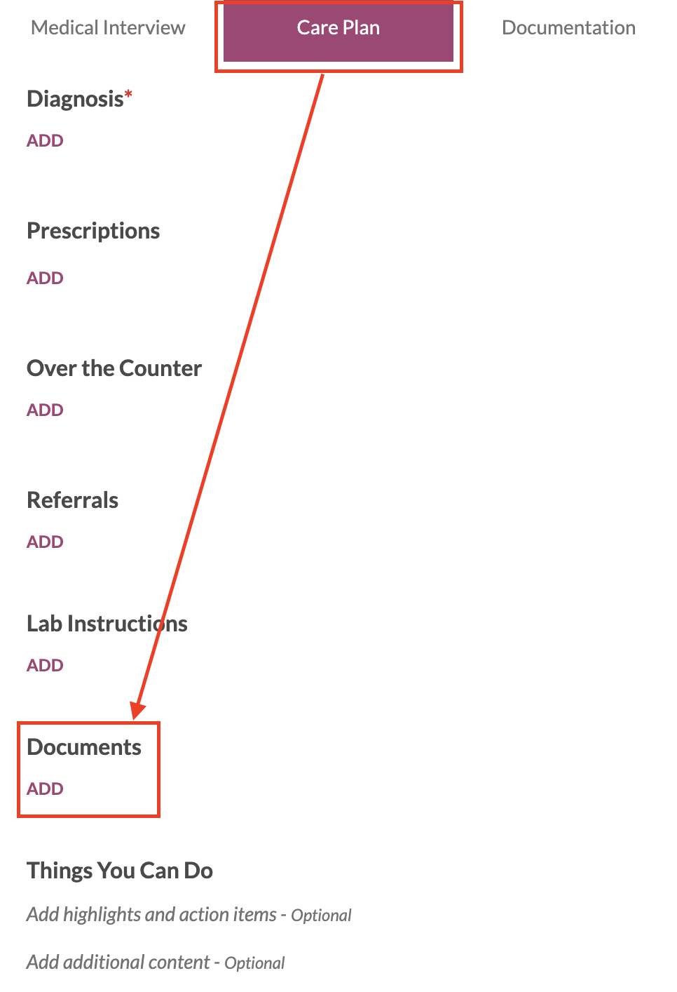 From within the Care Plan, navigate to Documents, and then select ADD.