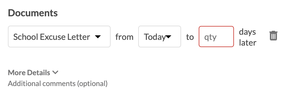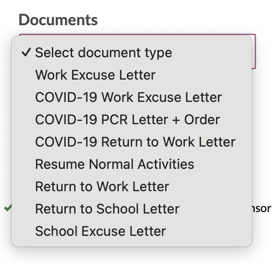Some document types require more information than others. For example, school or work excuse documents require the clinician to select the start day, along with the number of days the document is effective. Note that the start day can also be selected retroactively, if needed.